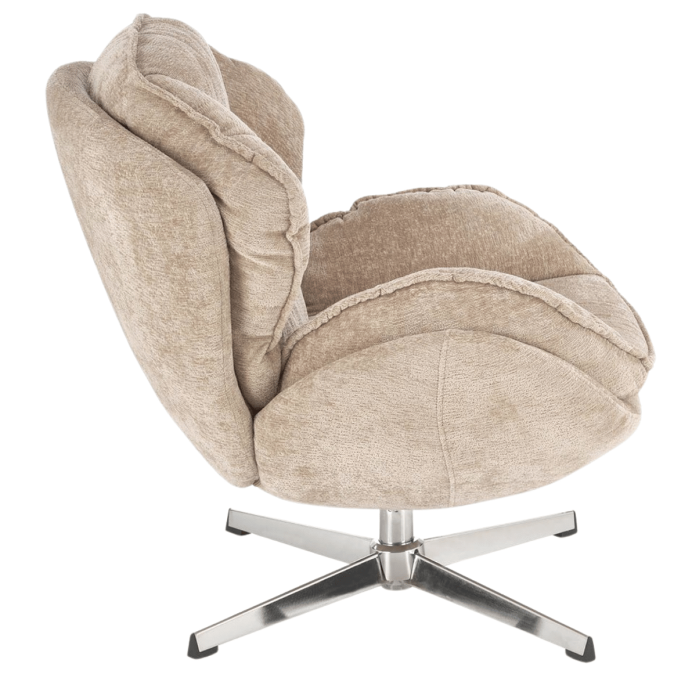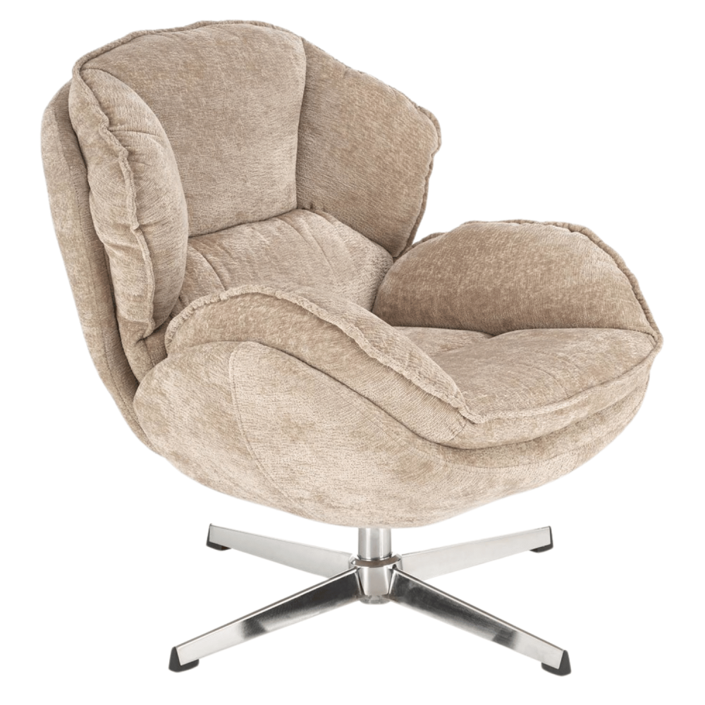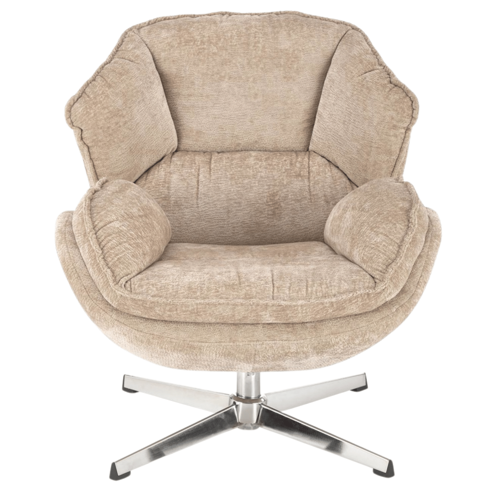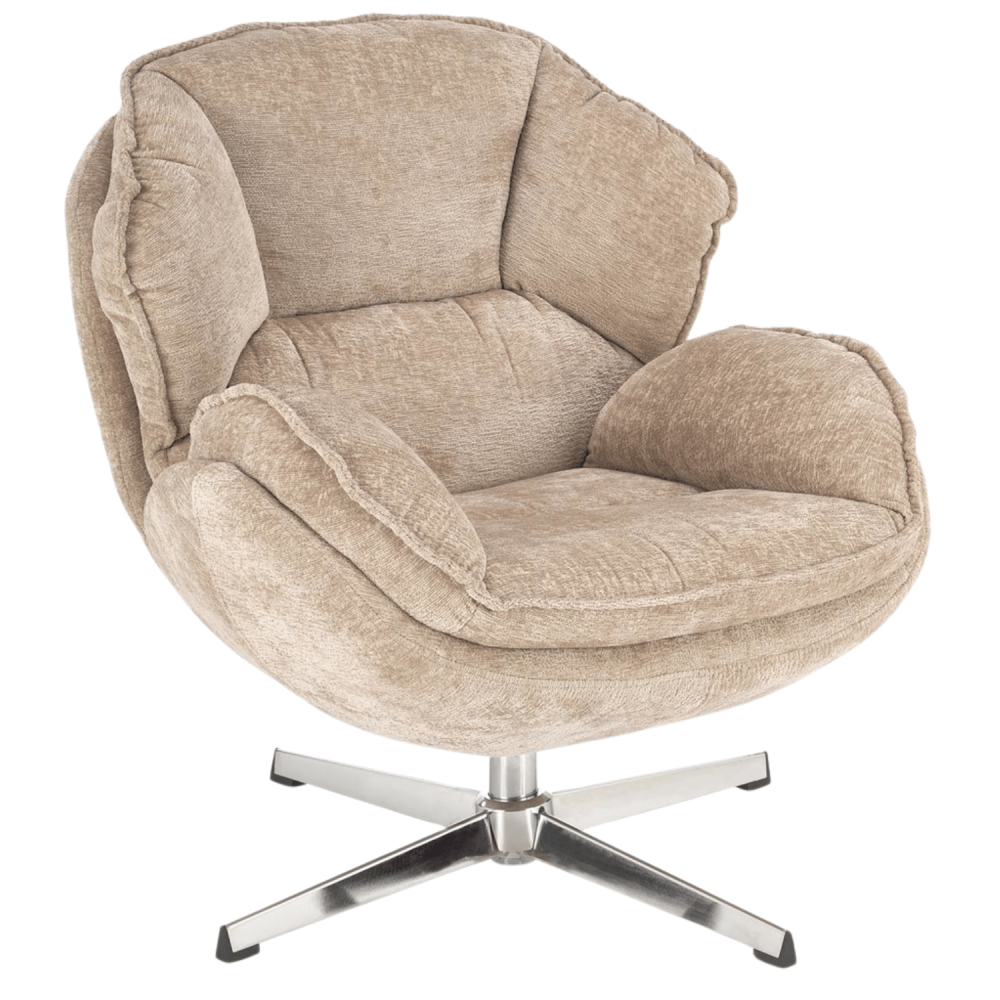 Dzięki funkcji obrotu o pełny kąt, GUIDO oferuje maksymalną elastyczność użytkowania – idealną zarówno przy pracy, jak i podczas relaksu w salonie. Przestronne siedzisko (szerokość 80 cm, głębokość 84 cm) i wysokość siedziska 40 cm zapewniają pełne wsparcie dla ciała, a miękka beżowa tkanina dodaje wnętrzu ciepła i przytulności. Błyszczący chromowany stelaż nadaje fotelowi nowoczesnego, lekko industrialnego charakteru, a jednocześnie gwarantuje wyjątkową trwałość i stabilność.