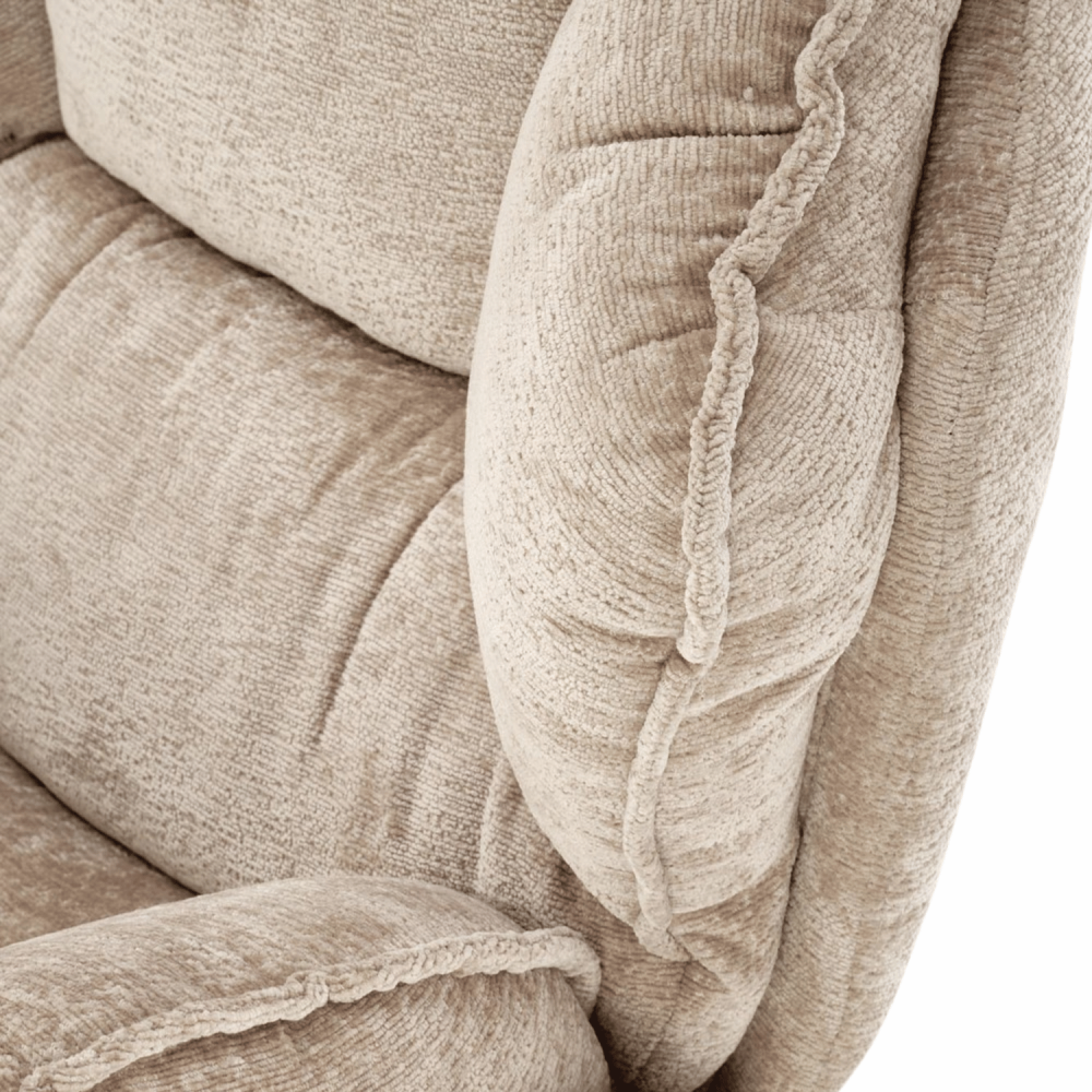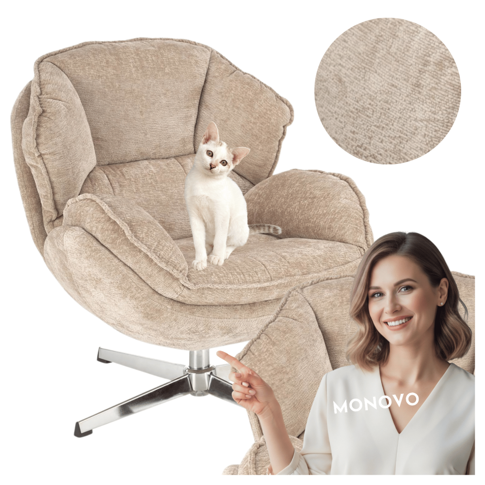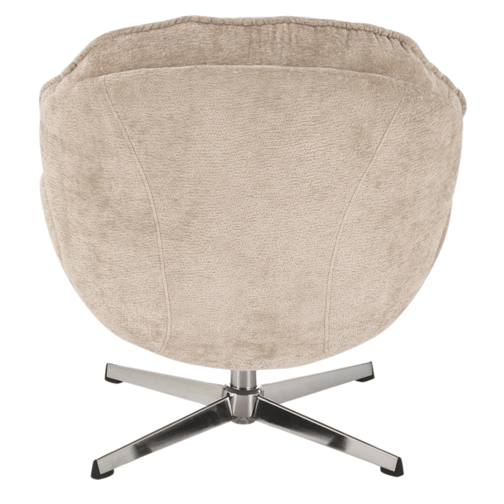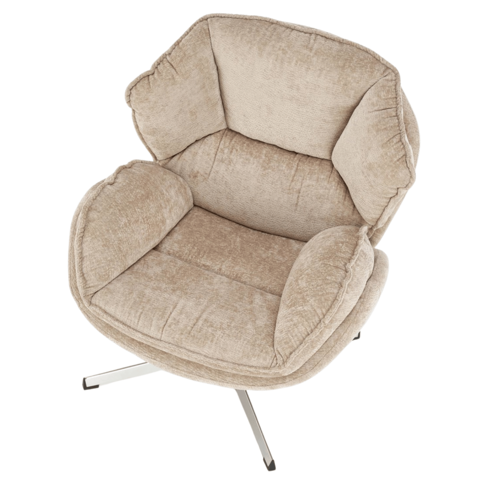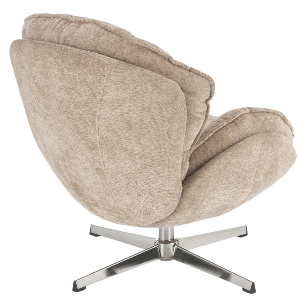 Dzięki funkcji obrotu o pełny kąt, GUIDO oferuje maksymalną elastyczność użytkowania – idealną zarówno przy pracy, jak i podczas relaksu w salonie. Przestronne siedzisko (szerokość 80 cm, głębokość 84 cm) i wysokość siedziska 40 cm zapewniają pełne wsparcie dla ciała, a miękka beżowa tkanina dodaje wnętrzu ciepła i przytulności. Błyszczący chromowany stelaż nadaje fotelowi nowoczesnego, lekko industrialnego charakteru, a jednocześnie gwarantuje wyjątkową trwałość i stabilność.