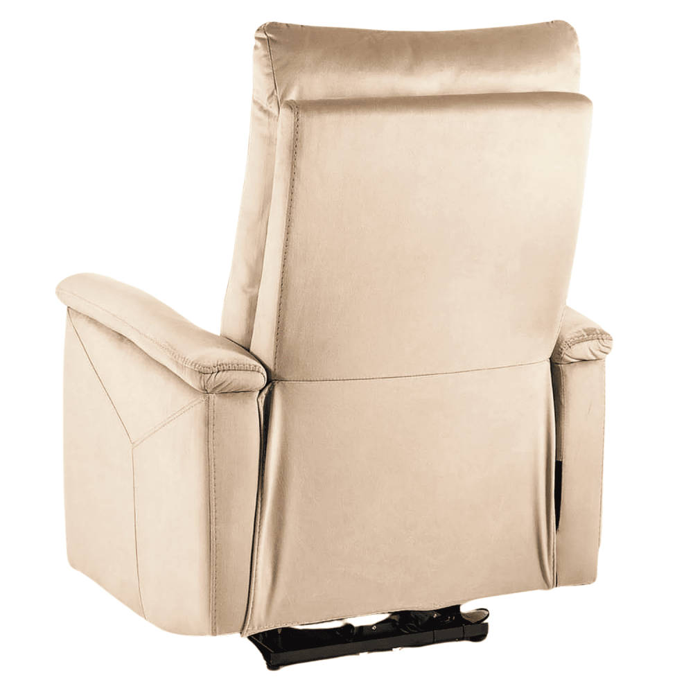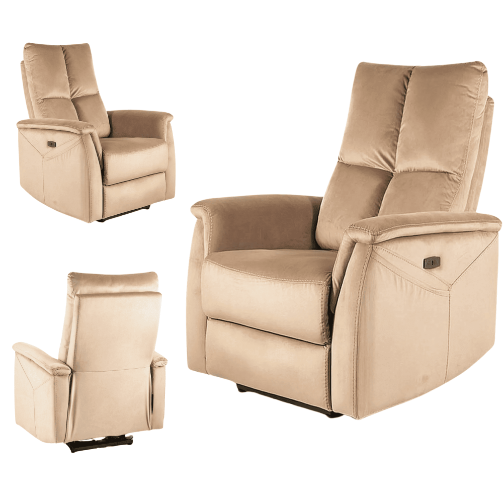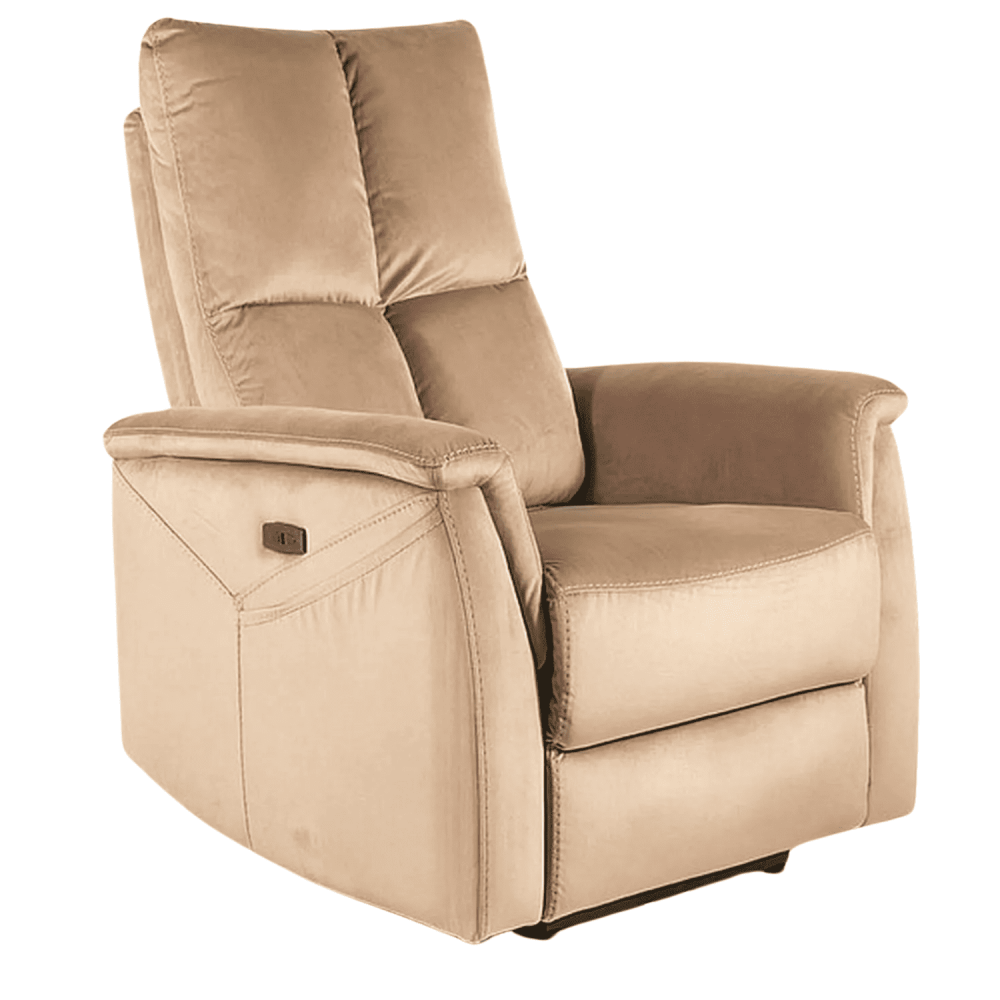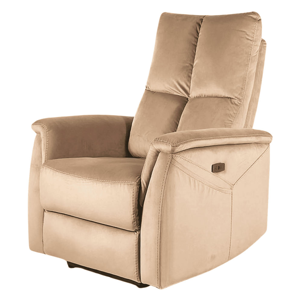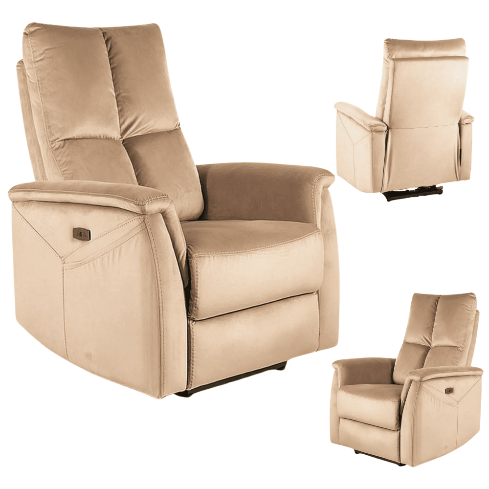 Fotel rozkładany elektrycznie z funkcją masażu, tkanina aksamit: Bluvel, kolory: beżowy 28. Sterowanie rozkładaniem za pomocą panelu na prawym boku fotela. Panel wyposażony dodatkowo w podświetlany port USB. Funkcje masażu regulowane za pomocą przewodowego pilota, w opcji: czas pracy, wybór strefy i intensywności masażu, podgrzewanie odcinka lędźwiowego. Bok fotela posiada praktyczną kieszeń.