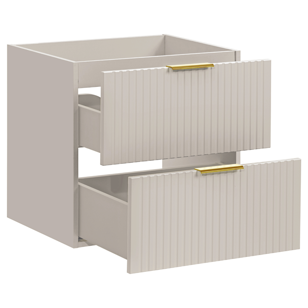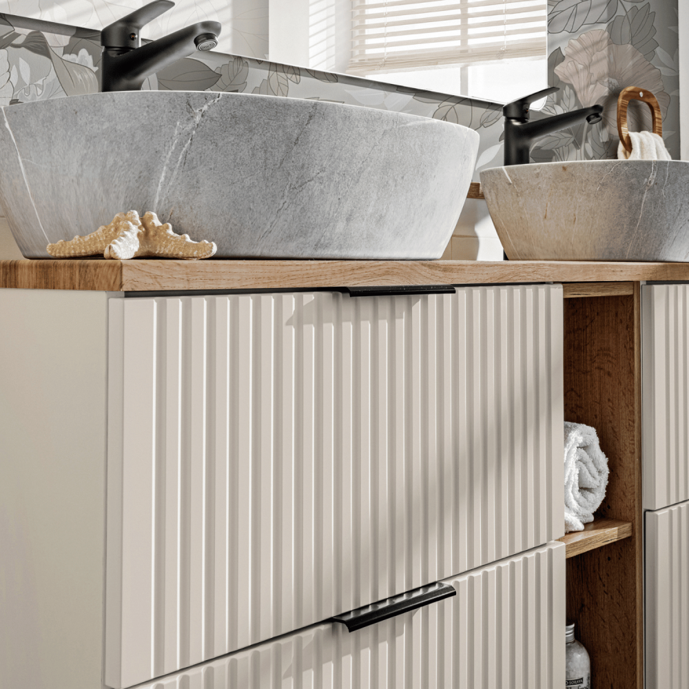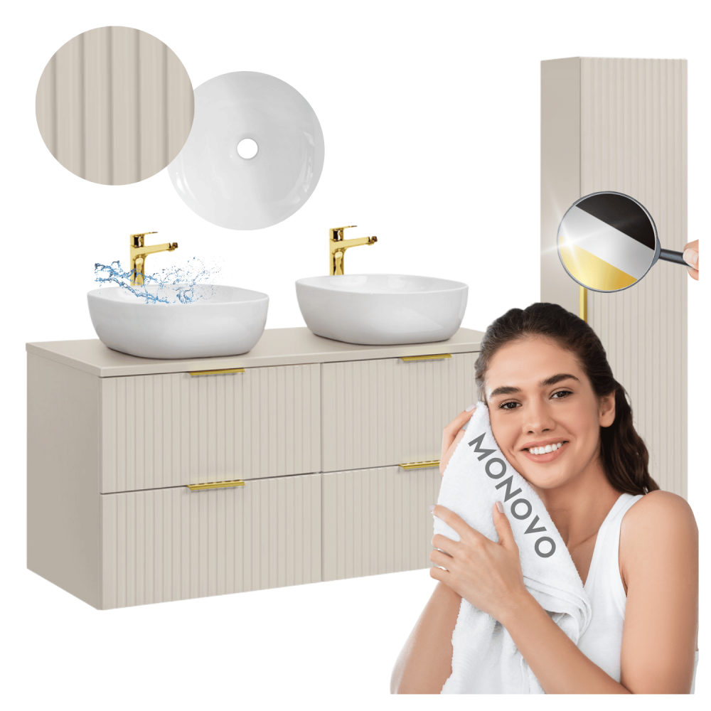 Ten ekskluzywny zestaw mebli łazienkowych ADEL CASHMERE stanowi gotowe rozwiązanie dla wymagających aranżacji. Dwie wiszące szafki o szerokości 60 cm każda tworzą 120 cm ciągu zabudowy z czterema pojemnymi szufladami, idealnymi do przechowywania kosmetyków i akcesoriów. Elegancki blat w odcieniu beżu kaszmiru z matowym wykończeniem harmonijnie współgra z dwiema kwadratowymi umywalkami ceramicznymi SMILE 40 DP, których minimalistyczny design podkreśla nowoczesny charakter całości. Ryflowana struktura frontów dodaje subtelnej głębi, a wysoki słupek łazienkowy (140 cm) z trzema półkami stanowi praktyczne uzupełnienie, wykorzystując pionową przestrzeń na ręczniki i środki higieniczne. Montaż wiszący nie tylko ułatwia utrzymanie czystości, ale też optycznie powiększa wnętrze. Wykonanie z wysokiej jakości płyty MDF z powłoką odporną na wilgoć gwarantuje trwałość w łazienkowych warunkach, podczas gdy ceramiczne umywalki zapewniają łatwość pielęgnacji. To kompleksowe rozwiązanie dla dużych łazienek, łączące funkcjonalność z designerskim wyglądem w ciepłej, beżowej kolorystyce. Odkryj więcej inspirujących kompozycji w naszej kategorii zestawów mebli łazienkowych lub przeglądaj pełną gamę produktów z kolekcji ADEL CASHMERE. Dla użytkowników szukających dodatkowych rozwiązań polecamy również umywalki nablatowe w różnych kształtach i rozmiarach.