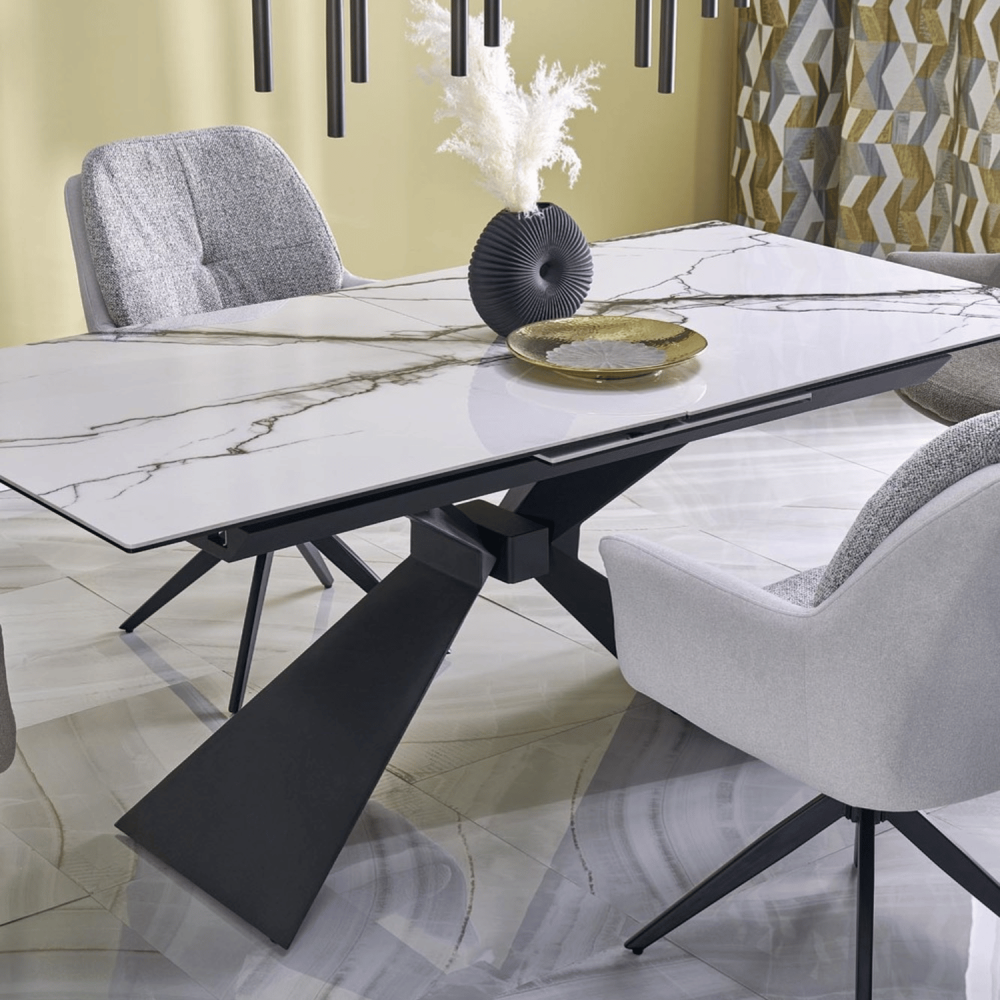 Poznaj stół rozkładany LUCIANO – połączenie minimalistycznego designu z najwyższą funkcjonalnością. Blat wykonany z ceramiki i szkła w odcieniu białego marmuru emanuje luksusem i doda blasku każdemu wnętrzu, a solidne nogi ze stali malowanej proszkowo w kolorze czarnym wprowadzają industrialny charakter. Dzięki mechanizmowi rozkładania zyskujesz przestrzeń na aż sześć osób, a rozstaw od 180 do 230 cm pozwala dostosować stół do wielkości pomieszczenia i liczby gości.