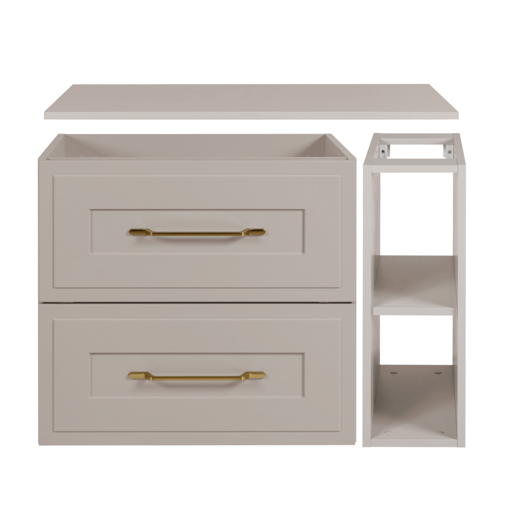 Kaszmirowy blat i regał nadają meblowi subtelną elegancję, a dwie szuflady w jasnoszarym kolorze zapewniają miejsce na kosmetyki, ręczniki czy akcesoria. Otwarty regał po prawej stronie jest idealny na często używane przedmioty lub dekoracje. Prowadnice kulkowe z cichym zamknięciem gwarantują płynne i bezgłośne otwieranie nawet w nocy.