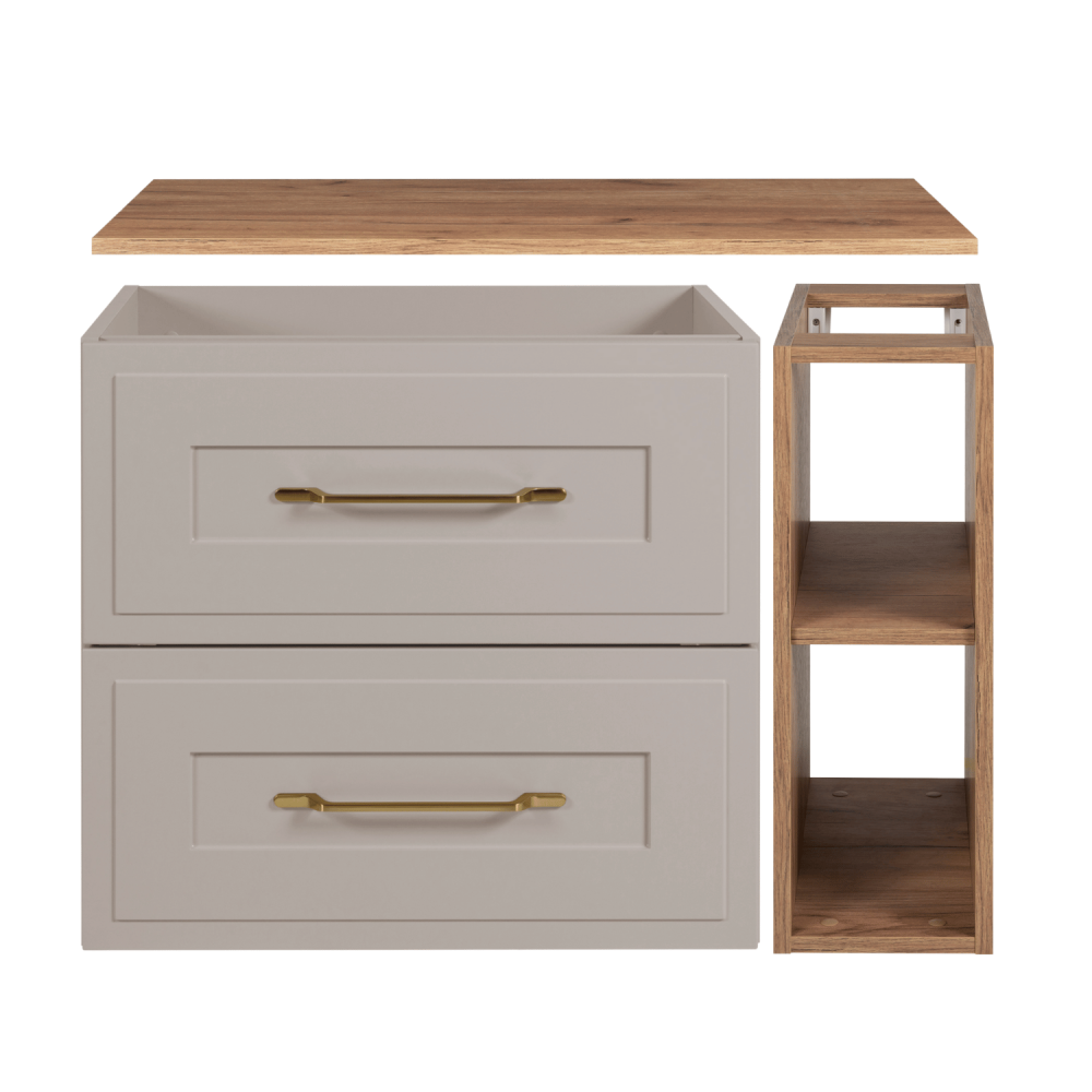 Twoja łazienka zasługuje na mebel, który łączy minimalistyczny styl z naturalnym urokiem drewna. Szafka CLASSIC CASHMERE o szerokości 80 cm to idealne połączenie kaszmirowego korpusu z szeroką ramką frontów, dwiema szufladami z funkcją SOFT CLOSE oraz blatem i regałem w kolorze dąb craft złoty – tworzące harmonijną całość, która wpasuje się zarówno w nowoczesne, jak i retro wnętrza z nutą elegancji.