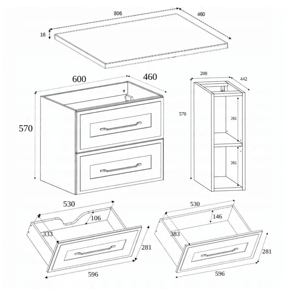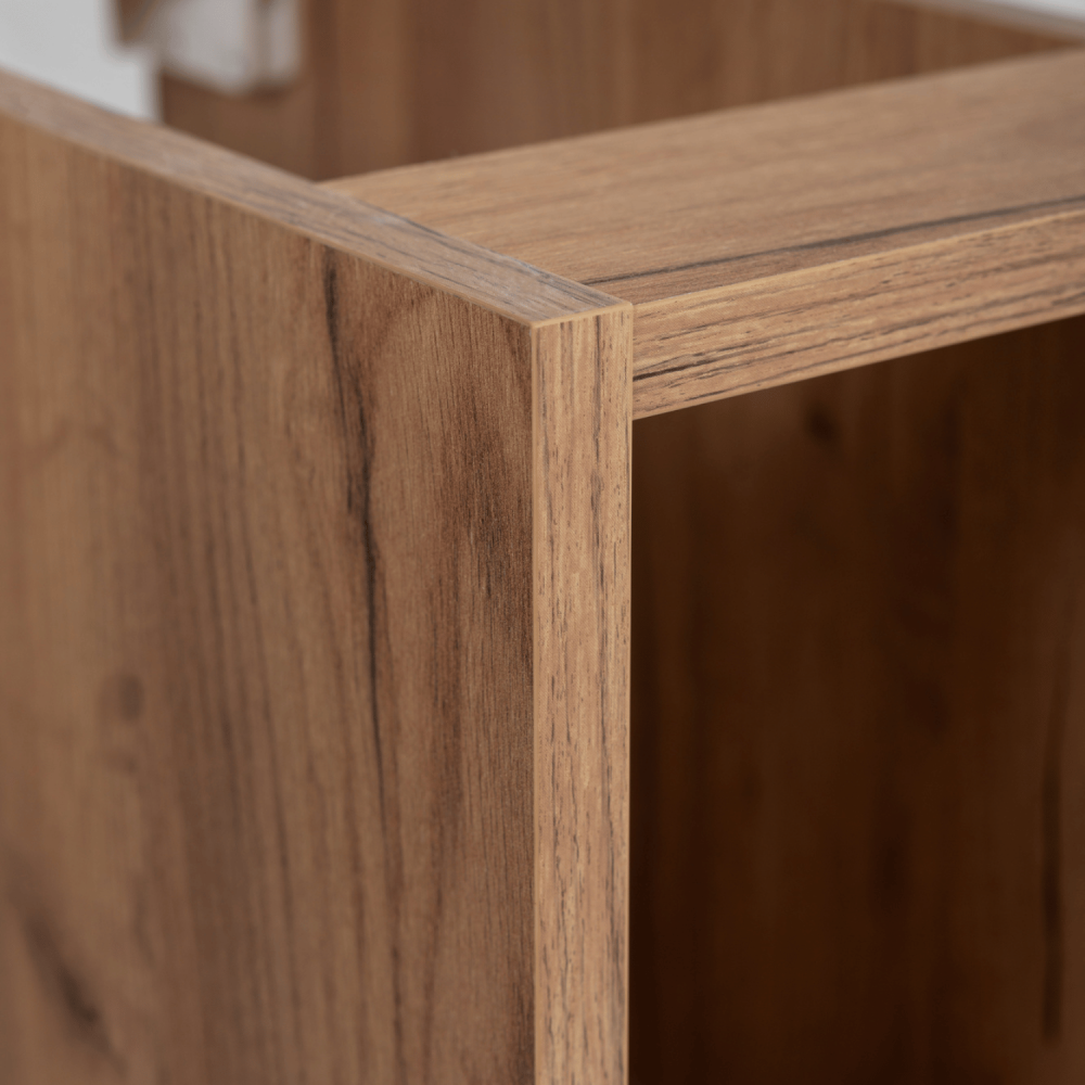 Kaszmirowy korpus nadaje meblowi delikatną delikatność, a blat i regał w kolorze dąb craft dodają przytulności i subtelnego akcentu. Dwie szuflady w jasnoszarym kolorze zapewniają miejsce na kosmetyki, ręczniki czy akcesoria, zaś otwarty regał po prawej stronie jest idealny na często używane przedmioty lub dekoracje. Prowadnice kulkowe z cichym zamknięciem gwarantują płynne i bezgłośne otwieranie nawet w nocy.