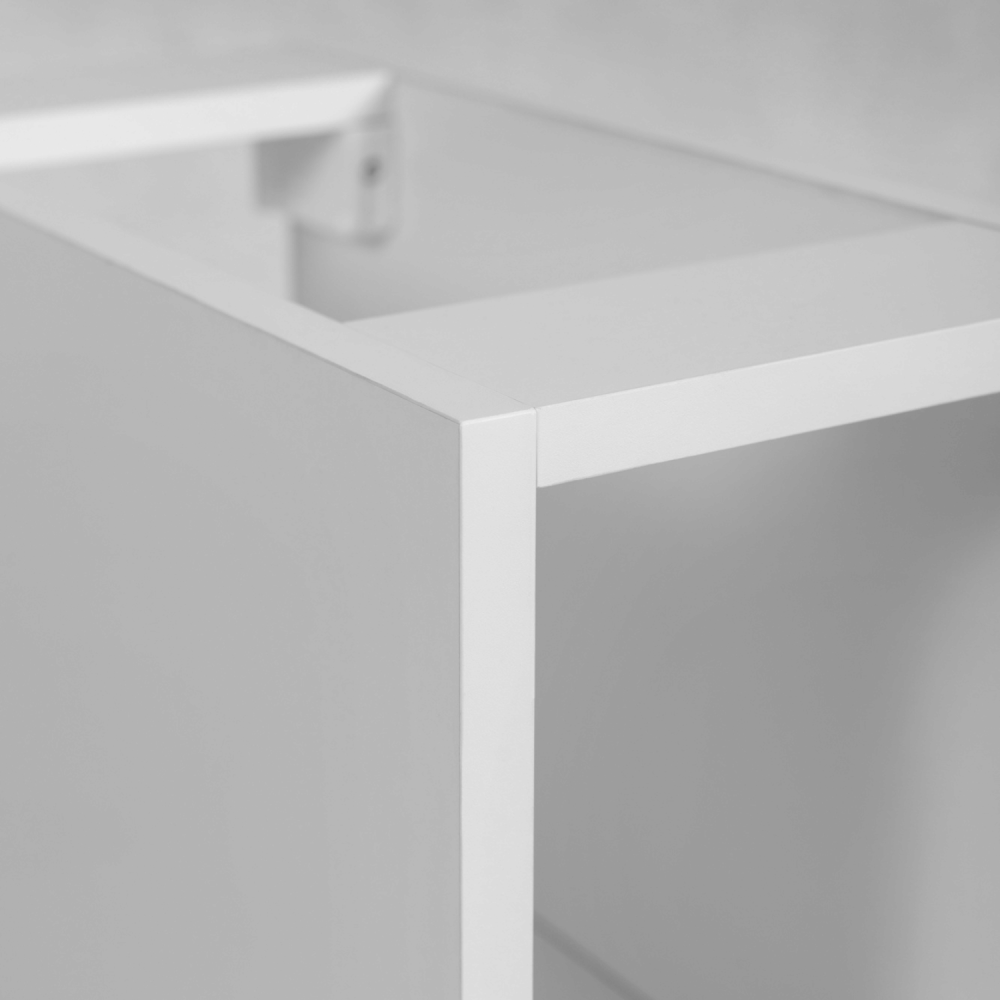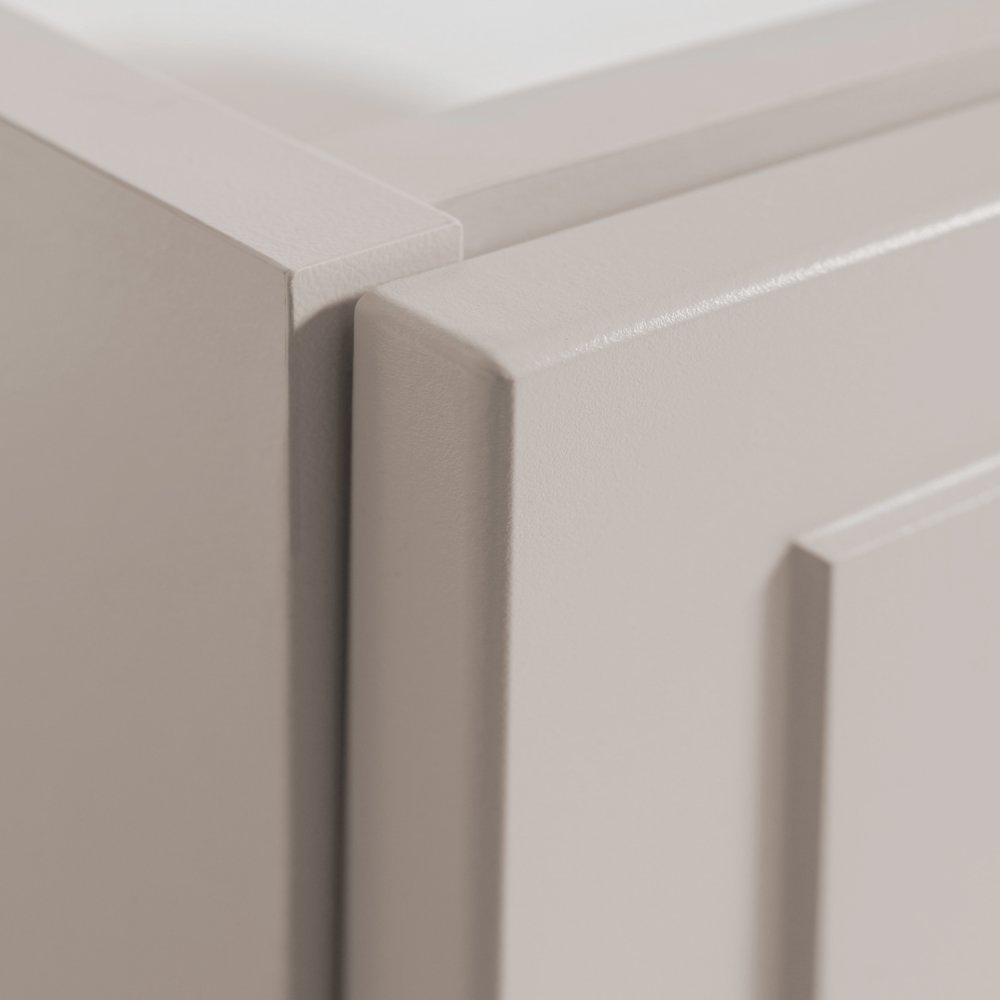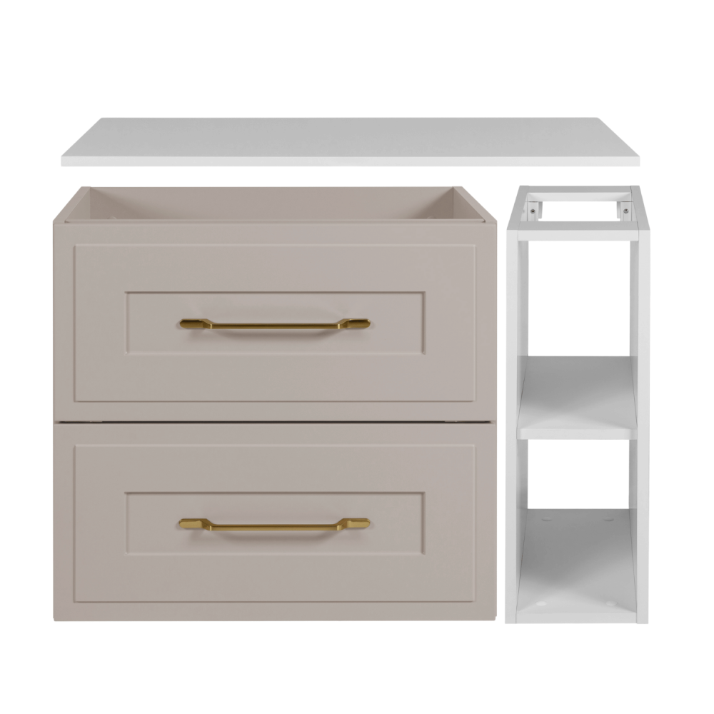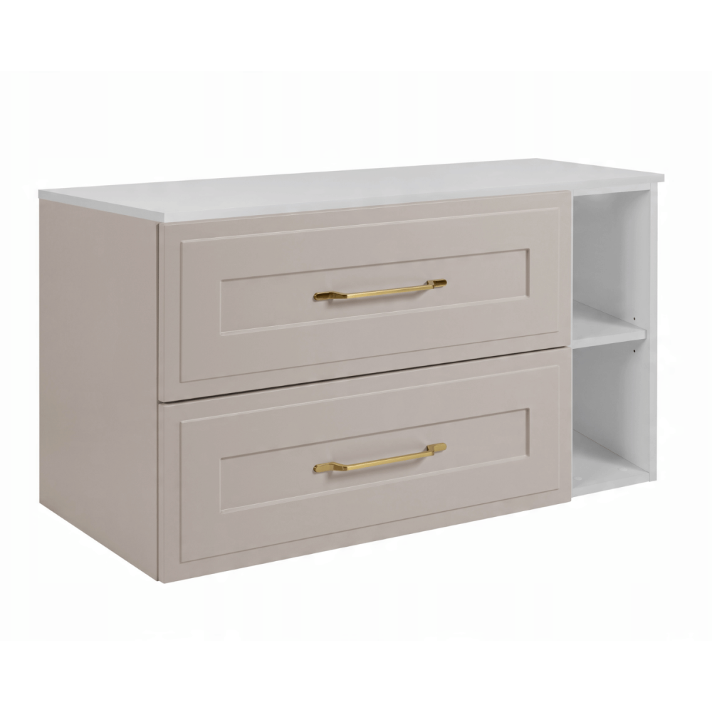 Kaszmirowy korpus nadaje meblowi subtelność i elegancję, a biały blat i regał dodają świeżości oraz nowoczesnego akcentu. Dwie szuflady w jasnoszarym kolorze zapewniają miejsce na kosmetyki, ręczniki czy akcesoria, zaś otwarty regał po prawej stronie to idealne miejsce na często używane przedmioty lub dekoracje. Prowadnice kulkowe z cichym zamknięciem gwarantują płynne i bezgłośne otwieranie nawet w nocy.