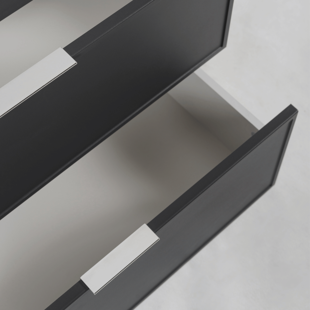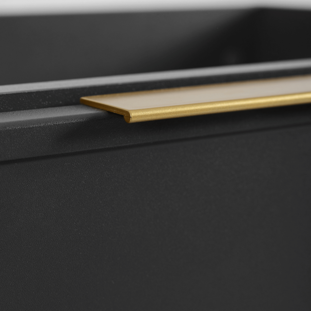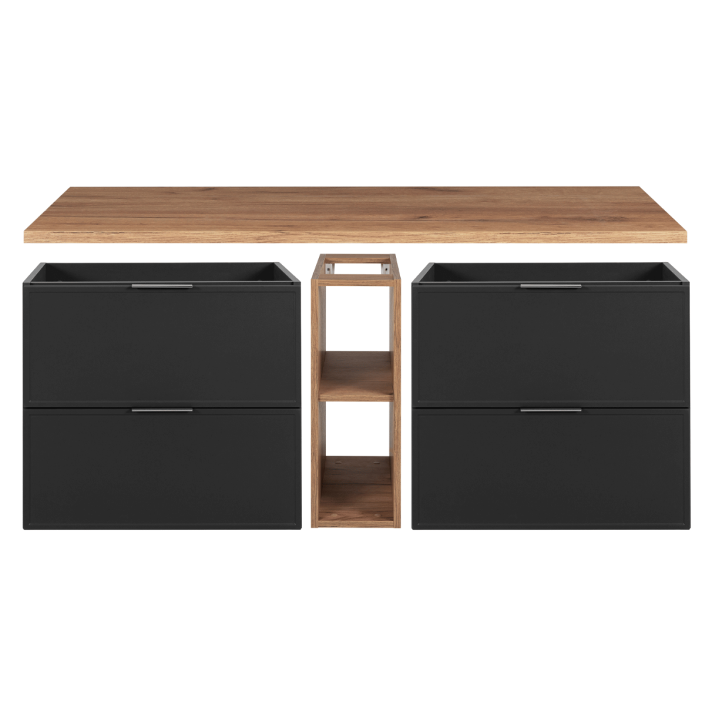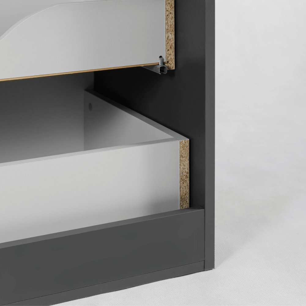 Ciemnoszary korpus nadaje meblowi subtelność i delikatność, a blat i regał w kolorze dąb craft dodają ciepła i przytulnego akcentu. Cztery szuflady z funkcją SOFT CLOSE zapewniają ciche i płynne otwieranie, a regał na środku to doskonałe miejsce na często używane przedmioty, dekoracje lub akcesoria. Konstrukcja z płyty laminowanej 16 mm i frontów z płyty MDF 16 mm gwarantuje trwałość nawet w wilgotnym środowisku. W zestawie dostępne są uchwyty w trzech kolorach: czarne, złote i srebrne – to Ty decydujesz o ostatecznym wyglądzie aranżacji.