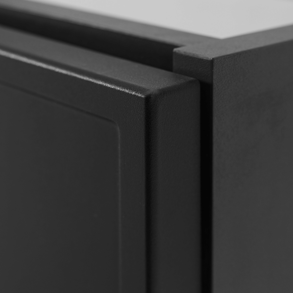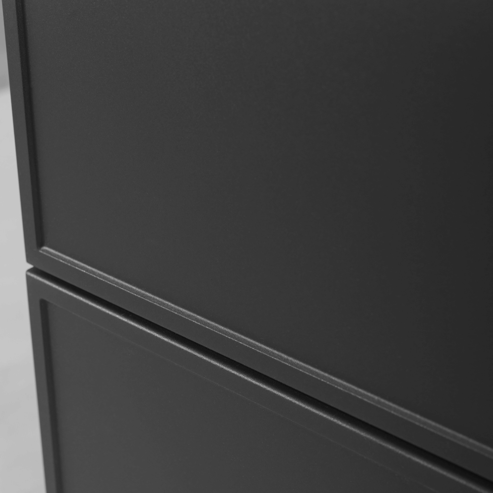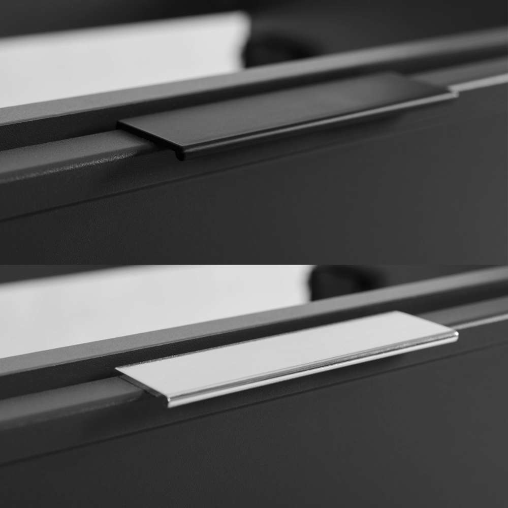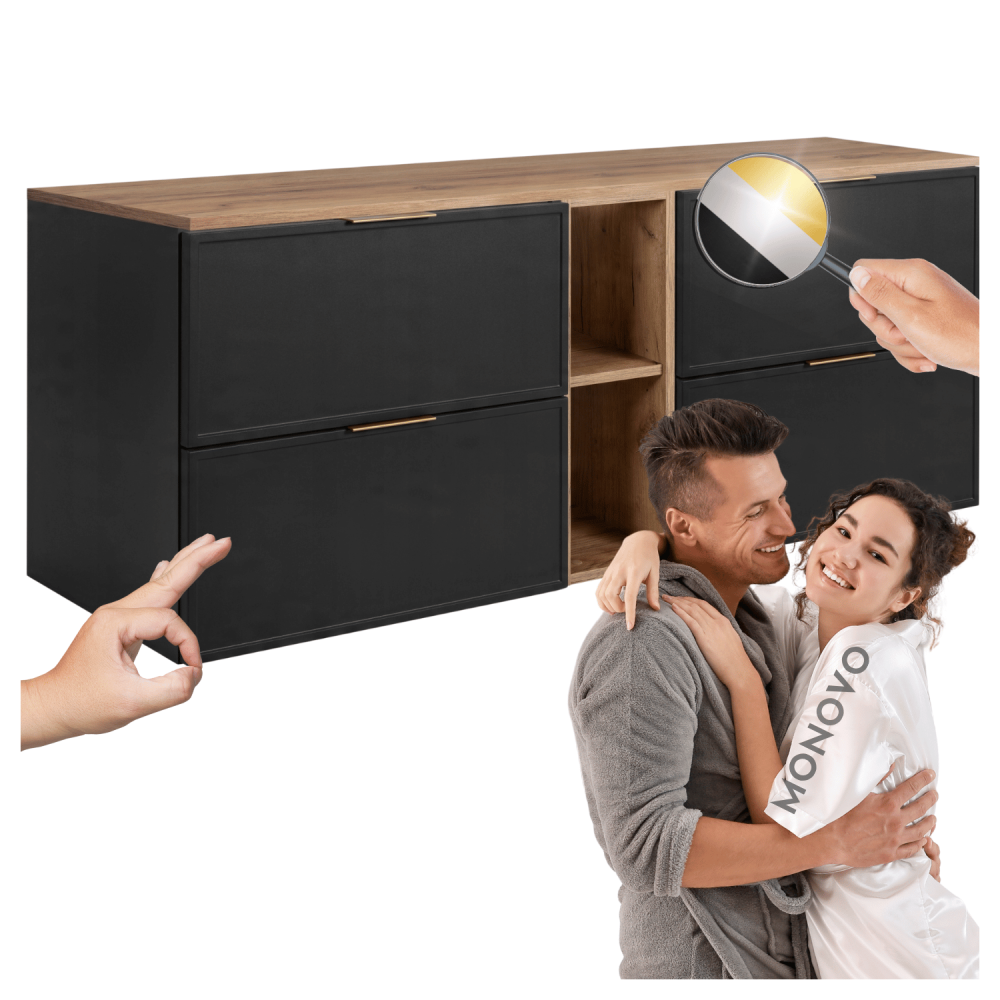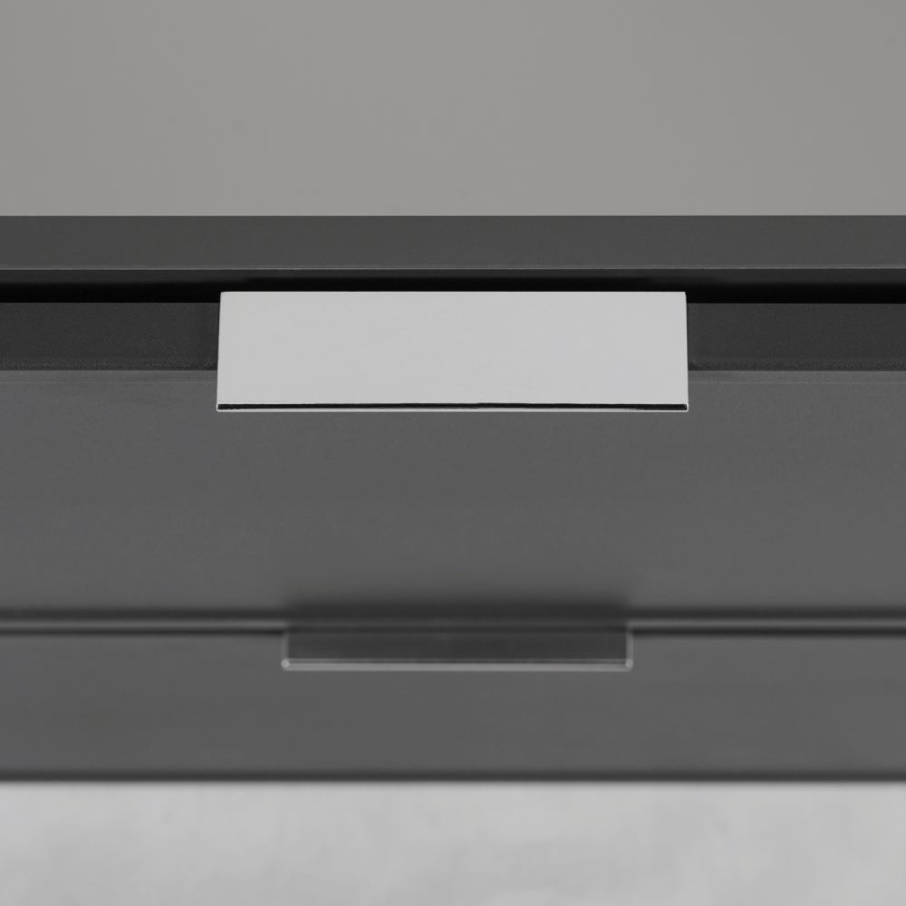 Ciemnoszary korpus nadaje meblowi subtelność i delikatność, a blat i regał w kolorze dąb craft dodają ciepła i przytulnego akcentu. Cztery szuflady z funkcją SOFT CLOSE zapewniają ciche i płynne otwieranie, a regał na środku to doskonałe miejsce na często używane przedmioty, dekoracje lub akcesoria. Konstrukcja z płyty laminowanej 16 mm i frontów z płyty MDF 16 mm gwarantuje trwałość nawet w wilgotnym środowisku. W zestawie dostępne są uchwyty w trzech kolorach: czarne, złote i srebrne – to Ty decydujesz o ostatecznym wyglądzie aranżacji.