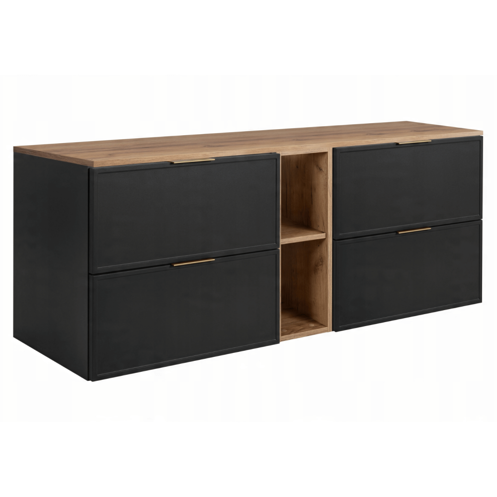 Twoja łazienka zasługuje na mebel, który łączy mocny charakter ciemnej szarości z naturalnym urokiem drewna. Szafka SLIM DARK o szerokości 140 cm to idealne połączenie ciemnoszarego korpusu z 4 szufladami w jasnoszarym kolorze oraz blatem i regałem w kolorze dąb craft złoty – tworzące dynamiczny zestaw, który wpasuje się zarówno w industrialne, jak i retro wnętrza z nutą luksusu.