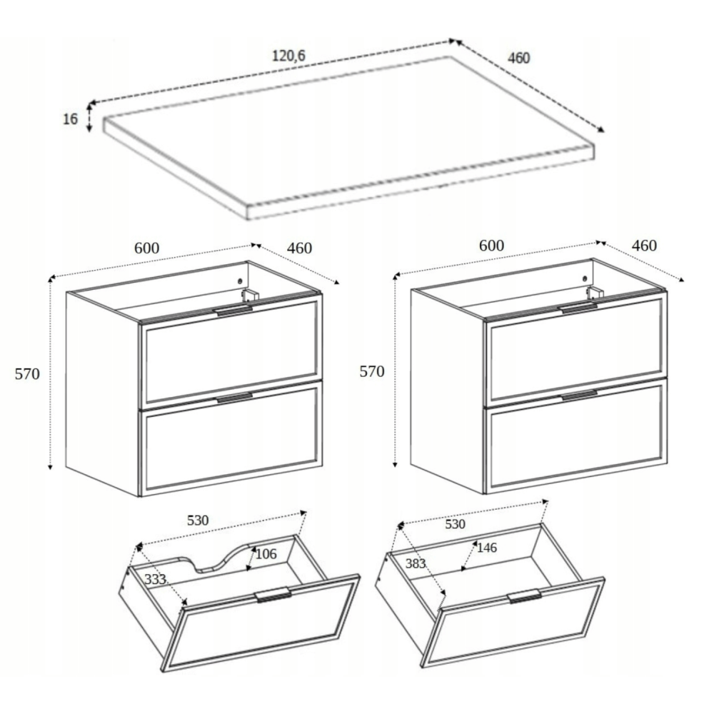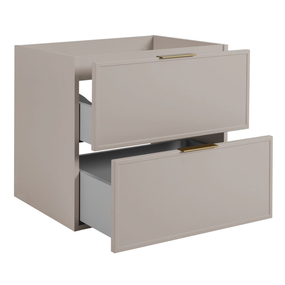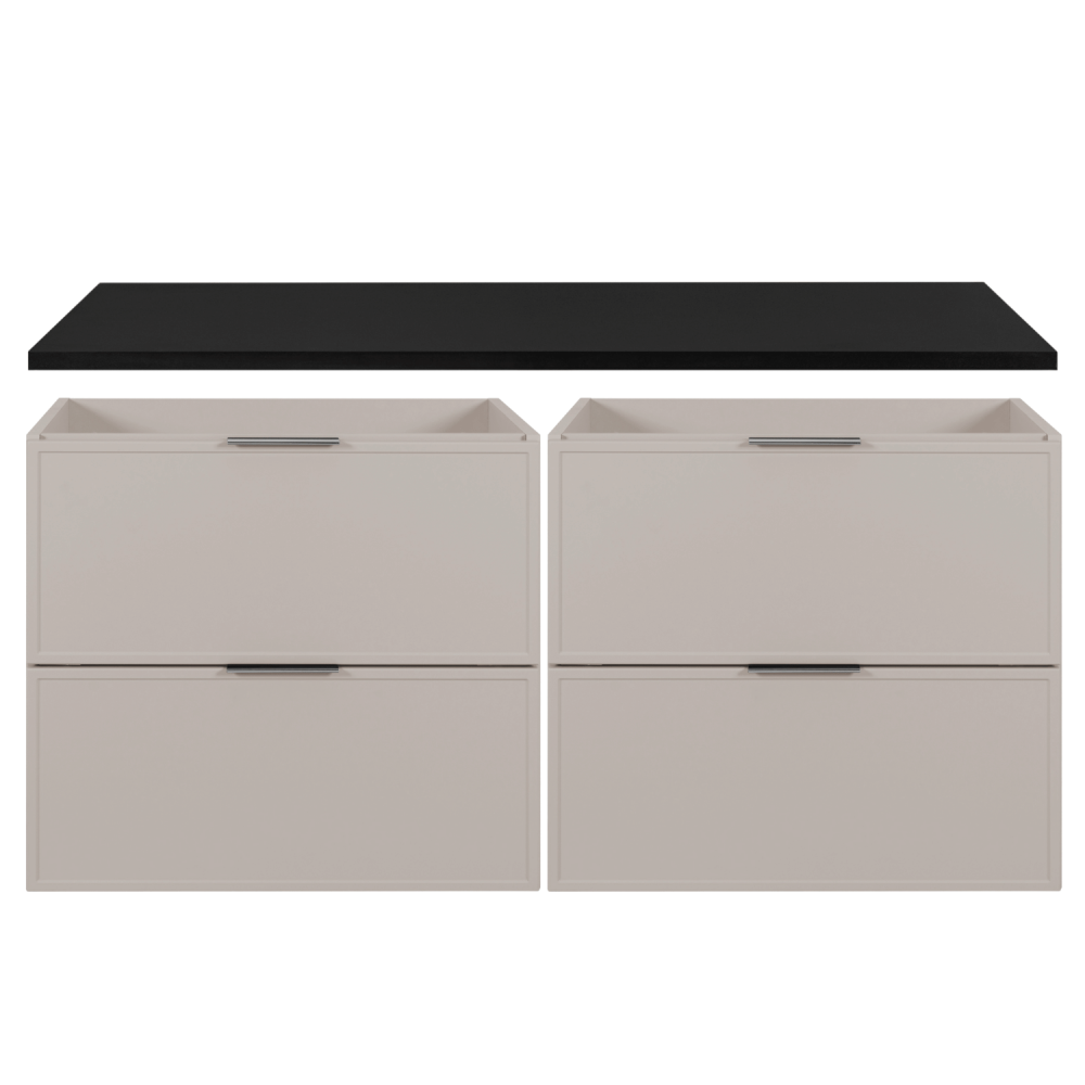 Kaszmirowy korpus nadaje meblowi subtelność i delikatność, a czarny blat dodaje głębi i nowoczesnego charakteru. Cztery szuflady w jasnoszarym kolorze zapewniają miejsce na kosmetyki, ręczniki i akcesoria, a prowadnice kulkowe z funkcją SOFT CLOSE gwarantują ciche i płynne otwieranie nawet w nocy. Płyta MDF 16 mm na frontach i płyta laminowana 16 mm na korpusie zapewniają trwałość oraz odporność na wilgoć.